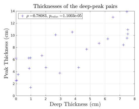 - Second (II), for each peak thickness, now considered to be the reference value ( in Figure A5), we generate correlated samplings of deep and peak thicknesses from uniform distributions around the reference value, using a Gaussian copula and a correlation coefficient . Peak thicknesses are uniformly sampled between and . The upper and lower bounds for the sampling of deep thicknesses (doted lines) are respectively the antecedents of and by the linear fit of experimental thicknesses of the deep-peak pairs (cf. Figure 9).