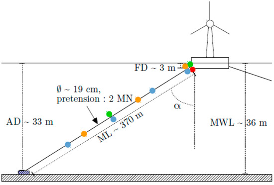 - Three tension sensors (orange). One close to the fairlead, a second at one-third of the line and a last at two-third of the line.