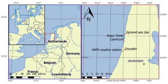 The study site is located south of Egmond aan Zee, the Netherlands (Figure 1). The straight coastline has an orientation of 7° east of north and consists of medium-fine sand with a median grain size of about 240 m. The beach is exposed to waves from the southwest to the north [38]. The Dutch coast has a significant offshore wave period and height of 5 s and 1.2 m, respectively, which do not show strong alongshore differences. During storms, the significant offshore wave height can increase to over 5 m. Especially storms from the northwest are responsible for surges more than 1 m. As a result, the intertidal beach can be flooded for several days [39]. The mean wind speed is 5.8 m/s, based on wind data from 1981 to 2010 measured at de Kooy, 40 km north of the field site [40]. During storms, U can attain values up to 30 m/s. The dominant wind direction at the site is south-southwest (210°–230° with respect to north).