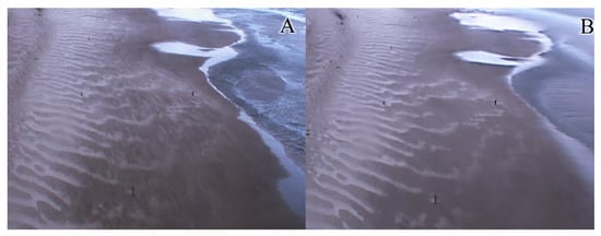 The beach south of Egmond aan Zee was monitored with an Argus video system [46] between April 1998 and October 2015. Argus is an optical remote sensing system pioneered by Holman and Sallenger [47] for sampling the nearshore environment. An Argus system consists of a suite of cameras at the top of a high structure to gain an unhindered view of the beach. A timing module is installed to ensure a synchronized collection of the images [48]. The Argus system at Egmond aan Zee consisted of five RGB-color cameras, which were mounted on a 45-m high tower on the upper beach. The cameras provided an 180 view, from south-southwest to north-northeast with a resolution of 640 × 480 pixels from 1998 to February 2004, 1024 × 768 pixels from 2004 to August 2005 and 1392 × 1040 pixels until 2015. Every 30 min, each camera produced three different oblique images: a snapshot, a time-exposure (timex) and a variance image. Only the first two types of images are used in this research. The timex images were created by images taken with a frequency of 2 Hz over a 10-min period. This procedure blurs out all movement in the 10-min time frame, such as individual waves breaking on the subtidal bars and aeolian streamers on the beach. The movement of streamers is thus best noticeable when a snapshot and timex of the same hour are compared: an active streamer can be seen on a snapshot image, but not on a timex image (Figure 2). This makes them stand out from immobile, small, irregular patches of dry sand that look like streamers on a snapshot image. Both snapshot and timex image can be used to determine the movement of aeolian bedforms called sand strips (Figure 2), but as sand strips move relatively slowly (a few meters per hour [21]), subsequent hourly images must be studied to see their movement. The footprint dimensions of individual pixels (the projection of a square image pixel on the ground) give the theoretical accuracy of the images, which is close to rectangular (with the alongshore side being larger). For the post-2005 data, the cross-shore footprint dimension is less than 0.2 m, while the alongshore size increases from 0.2 m at 100 m from the tower alongshore to ≈1.5 m at 400 m.