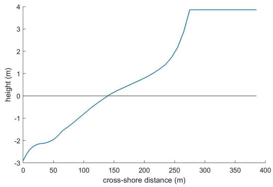 The model has been set up to fit the conditions found at Egmond aan Zee (Table 2). The chosen hydraulic conductivity K and infiltration coefficient were obtained by minimizing the error between modelled groundwater values and observations at 5 cross-shore locations collected at the study site in October and November 2017 [49,50]. The settings for the Van Genuchten curve are taken from [34] and are also based on Egmond observations. The applied cross-shore profile is given in Figure 4. It is nearly planar with a 1:55 slope. The bed profile was made by averaging three beach profiles that crossed or were near the study site. The profiles were taken from the JARKUS dataset, annual bathymetrical and topographical measurements that provide cross-shore beach profiles along the entire Dutch coast at an interval of 200 to 250 m. For this study, the profiles closest to our study site (# 41.250, 41.500, and 41.750) measured in January 2012 have been used. The resulting alongshore-averaged bed profile, which runs from −3 m to almost +4 m with respect to MSL, was smoothed to create a monotonically increasing profile. The smoothed profile was extended with z = 4 m for another ≈150 m, where we expect oscillations in to have dampened completely. Finally, offshore wave heights and periods, as well as water levels were measured near the harbor of IJmuiden at ten-minute intervals. The wave conditions were used to compute wave set-up and the run-up location in Equation (2).