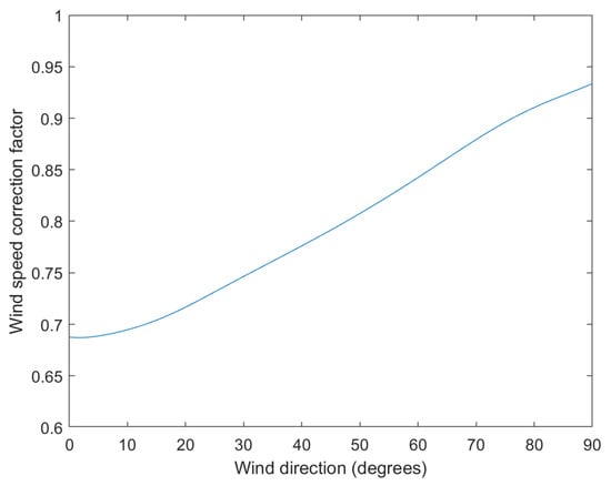 The correction factor needed when computing the local from regional wind velocities as a direction of regional wind direction. 0 is cross-shore (onshore).