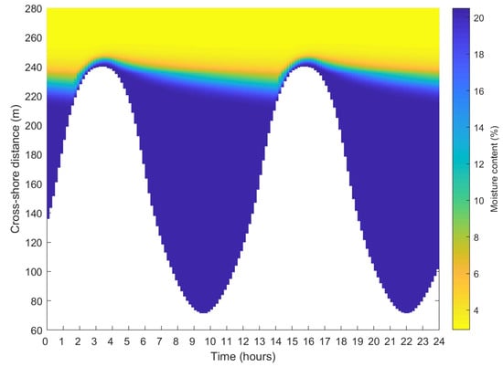 Surface moisture model output for a 12.5 h tide with an amplitude of 1.5 m, a wave height of 1.2 m, a wave period of 5 s, and using the parameters and bed profile for Egmond aan Zee. The figure depicts the model output for day 30 of the studied time period. The cross-shore distance runs from the sea (bottom of the figure) to the dunes (top of figure).