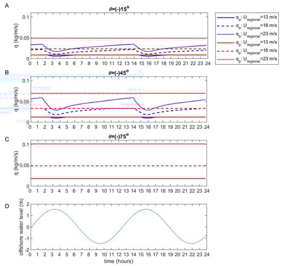 Several synthetic simulations were run to illustrate the output of the model and to aid in the interpretation of the Egmond simulations. We focus here on moisture and, in particular, aeolian transport rates, as output from the groundwater model have already been discussed extensively in [30,34]. The imposed conditions were a semi-diurnal tide of 12 h and 25 min with an amplitude of 1.5 m and a wave period and height of 5 s and 1.2 m, respectively. The regional wind direction varied from 0 to ±90 (with 0 being onshore) with a 15 step size and the regional wind speed was varied from 8 to 23 m/s with intervals of 5 m/s for each direction. To mimic the Egmond situation, the regional wind speed was transformed to the local wind. All other variables and parameters were set to fit the Egmond site (see Section 2.3). Each simulation was run for 30 days to account for the model’s spin up time. The results below focus on the 30th day.
