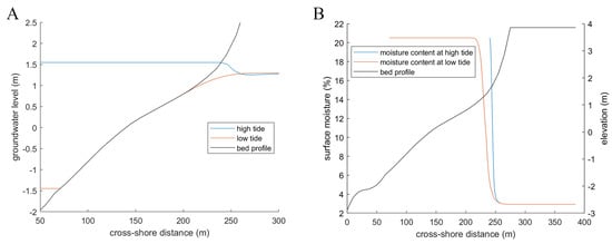 (A) Groundwater level during high and low tide and (B) surface moisture during high and low tide modelled by Aeolus.