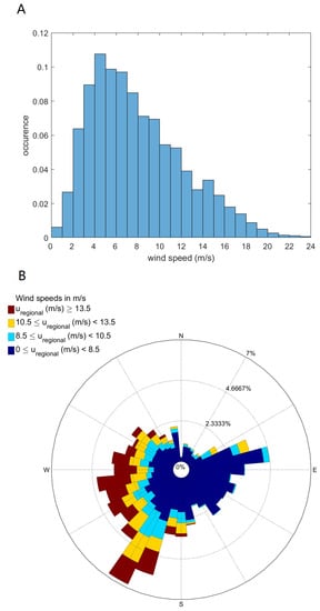 The most common regional wind speed during the studied time period from October 2011 to March 2012 was around 5 m/s (Figure 10A), while the average regional wind speed was 6.6 m/s. The largest wind speed encountered was 24 m/s. The dominant wind direction was south-west, followed by nearly westerly winds (Figure 10B). Westerly winds also showed a relatively large percentage of strong winds (>13.5 m/s).