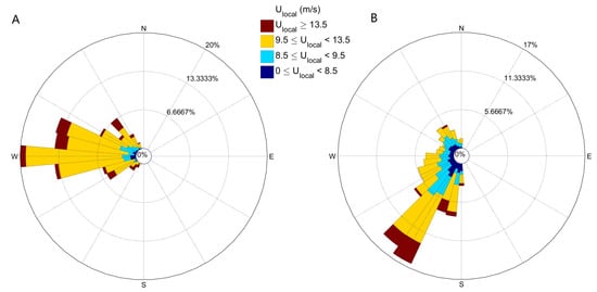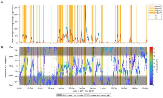 The ratio of depends on the wind speed and direction. The wind rose in Figure 12A is based on wind data with and in Figure 12B with . When 0.80, the wind is mostly strong and predominantly onshore directed. This wind direction is the most common for visual transport class 0 with wind class 3 and 4. Alongshore winds, on the other hand, are almost completely absent in this wind rose. The situation with 0.80 corresponds to winds with a predominantly alongshore direction. The few days when the wind blew onshore (from the west), the wind velocity generally did not exceed 12 m/s. Relatively small wind velocities (<9.5 m) are more common here than in Figure 12A. These findings are largely consistent with the results from the synthetic runs. It also corresponds to [23], who found that the wind direction is important during large wind speeds; only under alongshore winds the fetch length will be long enough for unlimited transport.