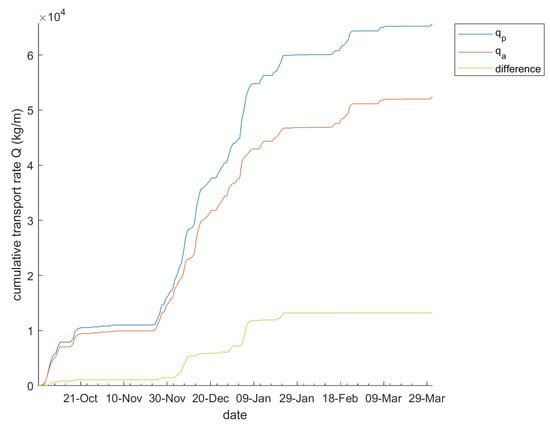 Although, as indicated in Table 4, the ratio of to is often large, the days when is well below do have a large influence on the cumulative transport in the study period. This is further illustrated with Figure 13. The total and from October 2011 to March 2012 (including night hours) is kg/m and kg/m, respectively. The amount of sand that reaches the dune foot (implementing the cosine effect) is kg/m and kg/m for and , respectively. This amount is larger than observed (see also [13]), as the dune volume at this site increases with kg/m/year during accretion periods [57]. An interesting future step is to calculate aeolian transport rates in supply-limited conditions, like the AeoLis model developed by [58].