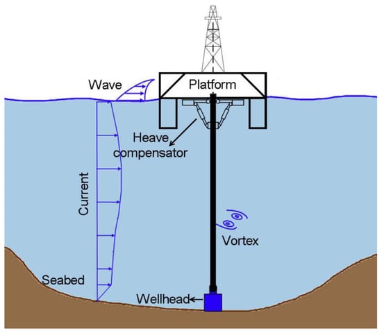 In recent years, owing to the large demand of crude oil, offshore oil and gas explorations have been shifted to deeper water regions. Risers are one of the basic elements of offshore installations that are usually used for drilling and production. The riser is installed between wellhead at the sea bed and floating platform. Actually, the riser has suffered the strong influences of environmental conditions in unshielded deep-water region, hence it has complicated dynamic behavior under the influence of platform’s motions, wind, waves and sea current, as shown in Figure 1. One of the most famous phenomena is vortex-induced vibration (VIV). When the riser moves under the action of sea current, vortices are shed along its surface, resulting in the formation of an unstable wake region behind it. Vortex shedding normally takes place with different frequencies and amplitudes, thus induces a periodically varying transverse force on the riser (i.e., perpendicular to the direction of the current), resulting in a periodically transverse vibration known as the VIV [1,2,3,4].