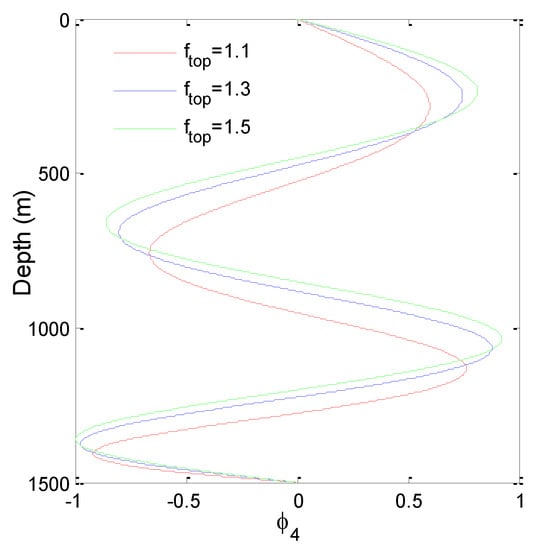 It shows that the deep-sea riser is like a cable owing to the large slenderness ratio, the lower order modes are mainly affected by tension and unrelated to the bending stiffness. The natural frequency of TTR will increase with the increase of top tension, it is equivalent to increasing the stiffness of TTR. The th natural frequency is about times of the first frequency (i.e., ), this is typical phenomenon of deep-sea risers. Meanwhile, the axial tension in riser gradually decreases with the increase of water depth due to the self-weight; the mode shape is no longer a standard sine function.