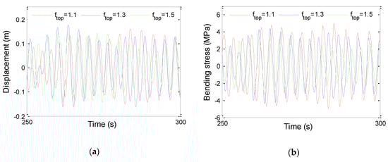 The VIV response of TTR can be calculated numerically by finite difference method (FDM) according to Equations (1)–(6). The time history of VIV of TTR at each depth are obtained. Figure 5 shows the displacement and bending stress of TTR at midpoint (z = 750 m). It can be seen that the change trend of displacement is not obvious under different top tensions, while the bending stress decreases significantly with the increase of top tension.