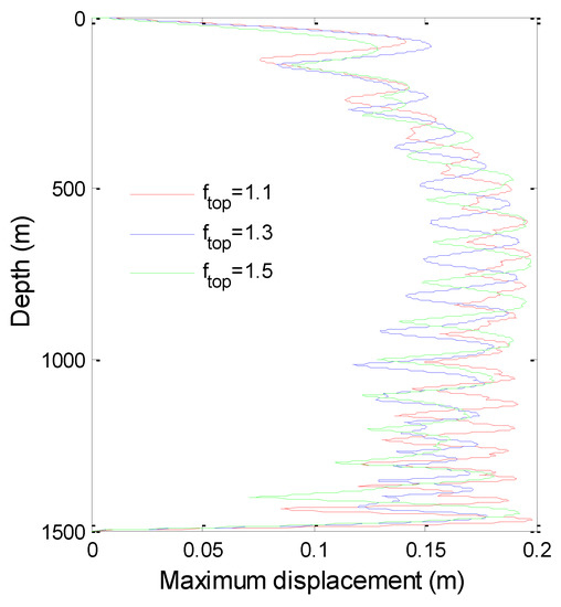 The maximum displacement of VIV of TTR is shown in Figure 15. The higher the top tension, the larger the displacement of TTR. It indicates that the natural frequency of TTR increases with the increase of the top tension, and the lower order modes of TTR are excited at the same current velocity. Therefore, the displacement is larger but the stress is smaller when the top tension is increasing.