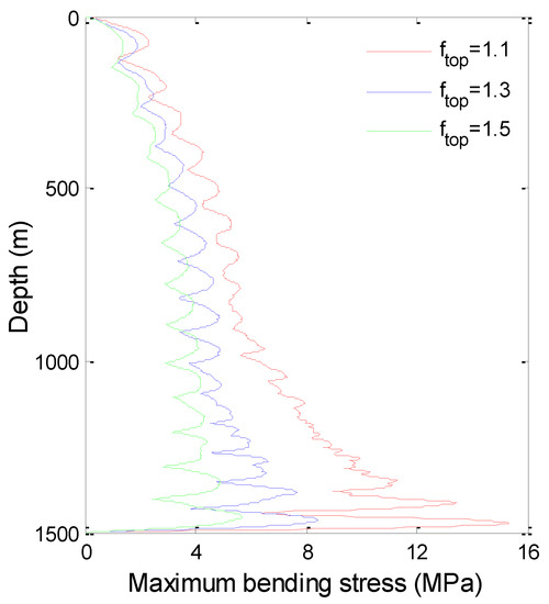 According to the time history of displacement and bending stress of each depth, the maximum displacement and the maximum bending stress of TTR are obtained, as shown in Figure 7 and Figure 8.