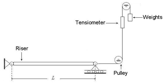 This experiment was carried out at the towing tank of Tianjin University (137 × 7 × 3 m). The TTR model was placed horizontally due to the limitation of the depth of tank, and the riser was hung at the bottom and moved at a constant speed in the towing tank. The top tension is presented by hanging weights at the top end of TTR, as shown in Figure 9. The stress of TTR at the midpoint was monitored by use of strain gauges.