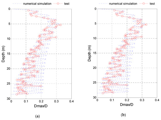 The maximum displacement of TTR (test data were from [21]). (a) Self-weight balanced in water. (b) Add-tens./Self-weight = 0.58.