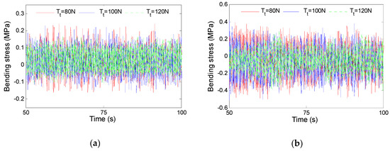 Bending stress time history of riser at midpoint. (a) U = 0.3 m/s, = 100 N. (b) U = 0.5 m/s, = 100 N.