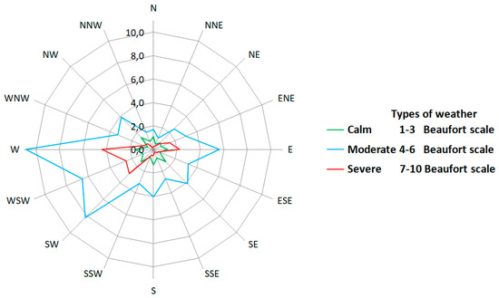 The average length of the “sea passages” (pilot station–pilot station) was 88.8 Nm (Figure 2). However, due to the lack of stabilizing devices and in order to ensure the safety of passengers and ro-ro cargo in severe hydrometeorological conditions, the weather route was often extended, in extreme cases increasing up to 177.7 Nm. The average specific fuel consumption (kg/Nm) over the “sea passage” and the average direction and wind force on the Beaufort scale were the next recorded data. Wind data were determined on the basis of an anemometer located at a height of 47 m above sea level. This device is coupled with the data of the continuous automatic (relative wind–real wind) conversion system. The averaging of prevailing winds data was subjectively made by officers on watch based on their own nautical experience. Figure 3 presents the frequency of occurrence of three types of weather/winds according to ferry navigator classification: