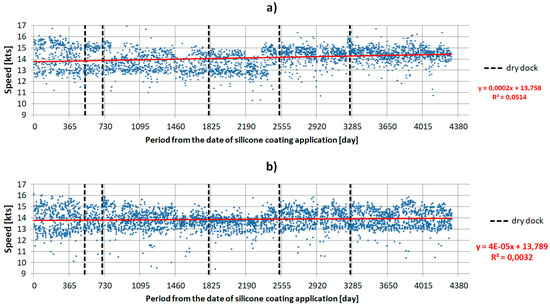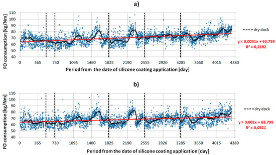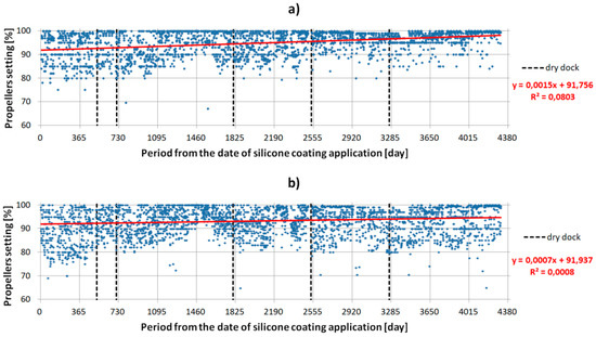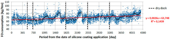 On the horizontal axis of all subsequent figures, the number of days with the application of the silicone coating is marked. Here, there are 12 vertical markers, one for each annual period. During the ship’s docking, the silicone coating was washed only by high pressure water. The characteristics presented in Figure 4, Figure 5, Figure 6 and Figure 7 have vertical dashed lines placed for each of the five dry dock cleanings. All diagrams include operational data as a function of the number of days since the silicone coating was applied.