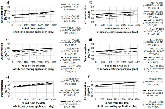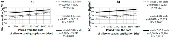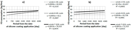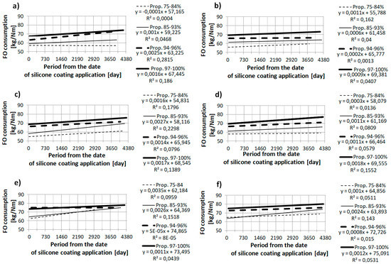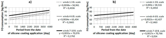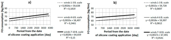 The characteristics presented on the graphs in Section 3.1 and Section 3.2 validate the relationship between the increase of fuel consumption and the time that has elapsed since the application of the silicone anti-fouling coating. From the point of view of formal statistical analysis, the presented single characteristics do not justify the statement that the available data are accurately matched to the presented regression equations, because the values of the determination coefficients R2 are relatively low [12]. However, the multiple linear regressions presented in Section 3.3 justify the impact on average fuel consumption of the time elapsed since the silicone anti-fouling coating was applied. The single linear equations may only lead to an approximate determination of the amount of average increase of fuel consumption. Equations and multiple linear regressions are disrupted by such factors as: