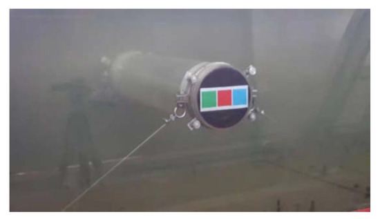 The present SFT model was made of PVC and steel materials, with the diameter of 0.16 m and length of 0.987 m. The model was sealed to prevent water penetration into it. In order to obtain different buoyancy to weight ratio (BWR), lead blocks were placed inside the SFT model. As depicted in Figure 1, the model was moored by wires linked to the front and rear sides of the model to fix it above the bottom. Three standard color blocks (i.e., red, green and blue) were stuck on the surface of the section in order to track the movement of the model. This will be described in detail in the following section.