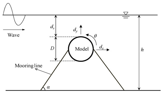 The present experiment was simplified as a 2D set up. Figure 2 presents the definition sketch of the moored SFT, in which some governing parameters were defined, including water depth h, submergence depth ds, diameter of the circular section D, and mooring line angle α. The motion characteristics of SFT, involving the sway, heave and roll are denoted by dx, dy, and θ, respectively, which will be mainly focused on in the results analysis and discussion.