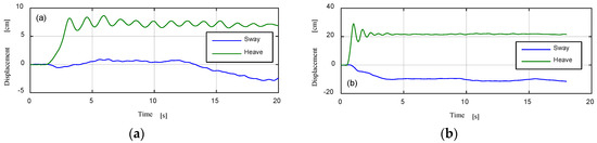 Before conducting the systematic experiments of the SFT motion exposed to waves, the free decay test was performed to determine the structural dynamic characteristics of the SFT. It was determined under still water conditions at a submergence depth of 17.5 cm. A force was applied to give the model an initial displacement. Subsequently the force was removed and the response was recorded. The time series of the displacement is depicted in Figure 4. It should be noted that the 8 cm for BWR = 1.54 and 20 cm for BWR = 1.9 denote the initial displacements rather than the motion amplitudes of the model. For the sway, no clear natural vibration was found, but the heave showed an obvious dampened periodic signal. Correspondingly, the natural period T0 and natural frequency ω0 of the SFT for different BWR were obtained and are listed in Table 3. As can be seen, with the increase of BWR, the natural period decreases and the natural frequency increases. We found that the natural period T0 for the case of BWR = 1.54 was 0.96 s, which is close to some wave conditions with wave period T = 0.92 s (as listed in Table 1). This means that resonance may have occurred for these wave conditions, which should be avoided in real world SFT engineering.