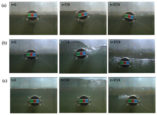 Figure 5 presents the observation of SFT motion during the process of wave and SFT interaction under different conditions. At the moment of t = 0, the SFT is initially still in the water. Figure 5a,b show the experimental observations for the cases of SFT on the water surface, and Figure 5c shows the observation for the case of SFT submerged under the water surface. At the moment of t = T/4, when the wave crest arrives at the SFT, a significant movement of SFT is found with large displacement and rotation. At this moment, the SFT moves to the highest point and rolls anticlockwise. The mooring line in front of the SFT is stretched tightly while that at the back becomes slack, which implies that the tension for the front line becomes largest while that for the rear line becomes zero. At the moment of t = 3T/4, when the wave trough arrives, the SFT moves downwards and rolls clockwise, meanwhile the front mooring line of the SFT becomes slack, while the rear line is stretched tightly.