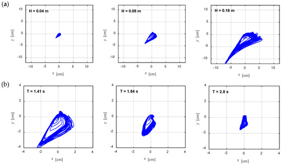 Figure 6 shows the xy-trajectories of SFT motion under different conditions. It generally demonstrates that the SFT moves towards the left bottom and the trajectories are mainly in the third quadrant, except for the case of mooring line angle α = 90° which shows a swing movement. More specifically, we can qualitatively identify the influence of related parameters on the SFT movement: (1) the amplitude of movement increases with increasing wave height (Figure 6a), whereas it decreases with increasing wave period (Figure 6b); (2) the motion amplitude is reduced significantly once the SFT is submerged under the water surface (Figure 6c); (3) with the increase of mooring line angle α, the mooring line mainly restricts the vertical movement while the horizontal movement is relaxed, which results in the sway of the SFT becomes larger than the heave (Figure 6d).