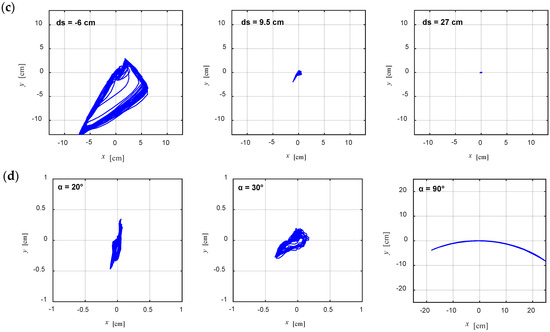Trajectories of SFT motion under different conditions: (a) T = 1.41 s, ds = −6 cm, α = 30°, BWR = 1.9; (b) H = 0.06 m, ds = 9.5 cm, α = 30°, BWR = 1.9; (c) T = 1.84 s, H = 0.26 m, α = 30°, BWR = 1.9; (d) T = 1.84 s, H = 0.26 m, ds = 9.5 cm, α = 30°, BWR = 1.9.
