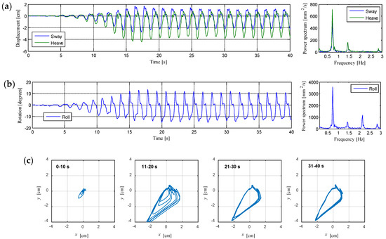 Time series and spectral analysis of motion characteristics for the condition of T = 1.41 s, H = 0.08 m, BWR = 1.9, ds = −6 cm, α = 30°: (a) sway and heave; (b) roll, and (c) trajectories for different periods.