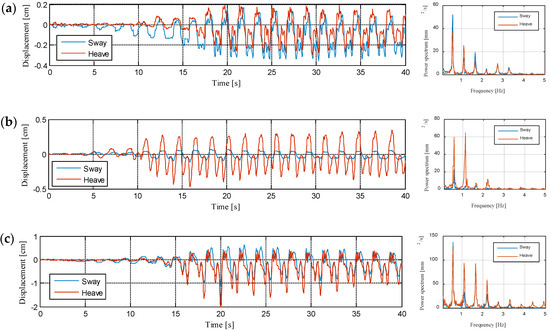 Time series and spectral analysis of sway and heave for the conditions of (a) T = 1.84 s, H = 0.26 m, BWR = 1.9, ds = 9.5 cm, α = 30°; (b) T = 1.84 s, H = 0.26 m, BWR = 1.9, ds = 9.5 cm, α = 20°; and (c) T = 1.84 s, H = 0.26 m, BWR = 1.54, ds = 9.5 cm, α = 30°.