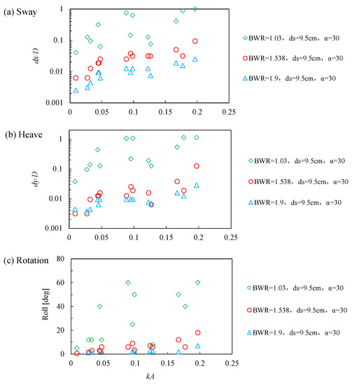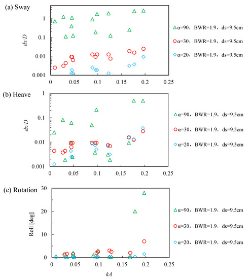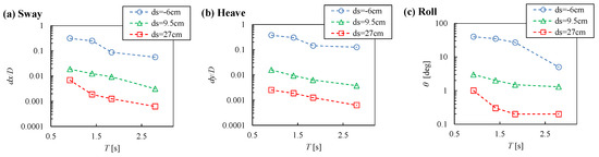 Figure 9 shows the motion characteristics varied with wave height in different wave periods for the case of BWR = 1.5, ds = 9.5 cm, α = 30°. In this figure, the motion characteristics are normalized by the diameter of model D. It clearly shows that as the wave height increases, each of the motion characteristic amplitude increases. This is reasonable because waves with a large wave height support more energy, as well as a large wave force to drive the SFT model moving. Additionally, Figure 9 also shows that for the cases of T = 0.92 s, the motion characteristics are obviously larger compared to other cases. As mentioned in the section on structural dynamic characteristics, the natural period T0 for the SFT of BWR = 1.54 is 0.96 s, which is close to the wave period of T = 0.92 s, and hence the resonance may have occurred, which intensifies the SFT movement.