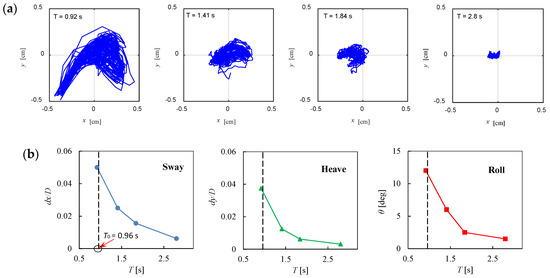 Figure 10 shows the influence of wave period T on the sway, heave and roll. As can be seen, the motion amplitude shows a decreasing tendency with the increase of T. To further identify the effect of wave period, we only selected the results with varied T and kept the other parameters at almost constant value, as plotted in Figure 11. The trajectories indicate that the movement becomes small as the wave period increases. In fact, the influence of wave period T is related to the natural period T0 of the structure. Figure 11b indicates that the motion characteristics are significantly enlarged when T is close to T0 (the dashed vertical line) due to the resonance. With the wave period farther away from the natural period of the structure, the motion characteristics decrease, and the rate of decrease becomes small. Therefore, in the design of SFT, the natural period should be adjusted to be far away from the wave period, such that the resonance can be avoided in order to guarantee the stability of the structure.