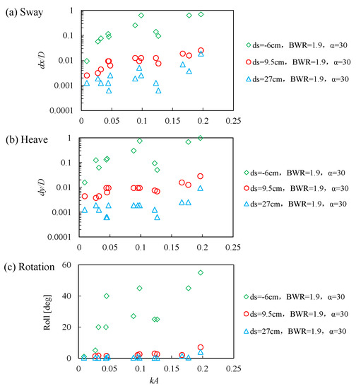 The motion characteristics of SFT under different submergence depths are plotted in Figure 12, where the horizontal axis kA represents the dimensionless wave number. The results show that the motion amplitude for the case with ds = −6 cm (i.e., SFT model is located at the water surface) is much larger than that of the submerged cases (i.e., ds = 9.5 cm and 27 cm), and particularly for the sway and heave, the amplitude for the case of ds = −6 cm is almost an order larger. For the case of ds = 27 cm, the amplitude of each motion characteristic is small, particularly for the value of roll that is almost zero as shown in Figure 12c. In addition, the variations of motion characteristics with kA do not exhibit a clear tenancy. In general, the amplitudes of motion characteristics decrease significantly with submergence depth.