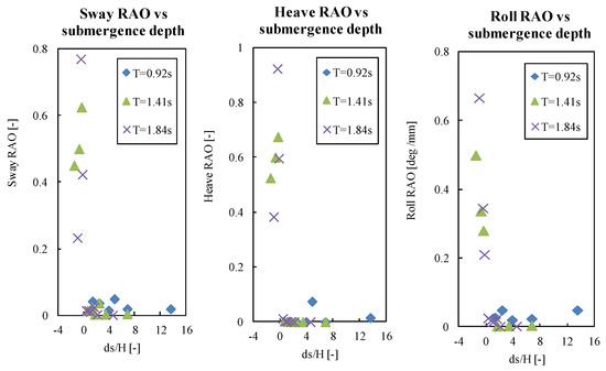 Sway, heave and roll RAO versus dimensionless submergence depth.