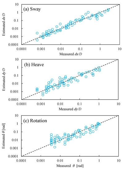where R2 represents the determination coefficient. The positive value of exponent of the wave height term indicates that the motion characteristics increase with wave height, whereas the negative value of the exponent of the wave period term indicates that the motion characteristics increase with wave period. This is consistent with the results of the aforementioned influencing parameter analysis. Likewise, the exponents of the other parameters included in the above equations also correspond to the experimental results and observations. The comparisons of the measured and estimated SFT motion characteristics are shown in Figure 16, which confirms the accuracy of Equation (3)–(5) as most of the data collapses to the perfect line (dashed line).