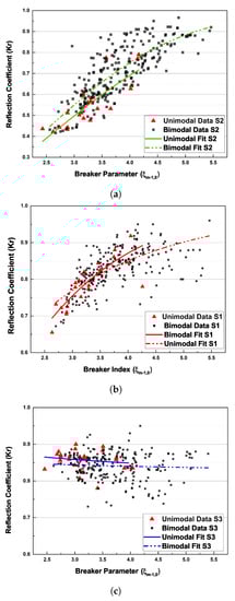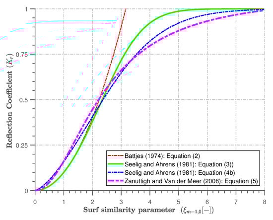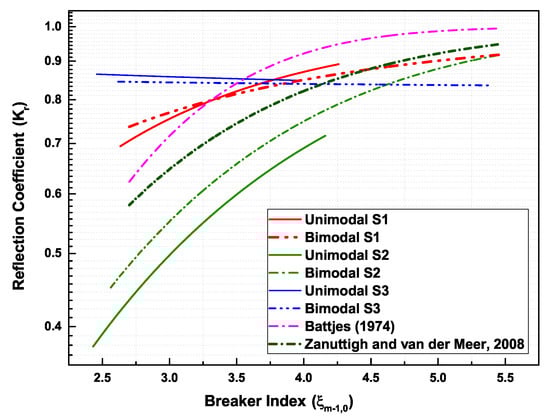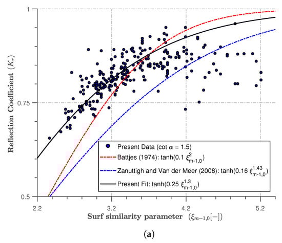 More accurate expressions were also proposed, based on several experimental studies that were performed to describe the reflection behaviours of other sea defences, including revetments, beaches, and breakwater. These expressions consider both the peak periods of irregular waves and the spectrally determined breaker parameter . These are described in Equations (4a) and (4b) below: