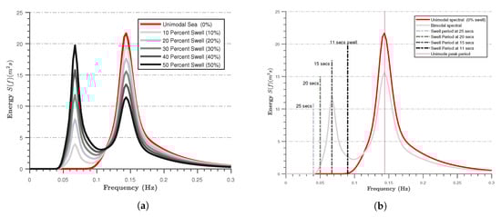 The Coastal Laboratory wave tank at Swansea University consists of an Armfield wave tank 30 m in length, 0.8 m in width, and 1.2 m in depth. Waves are generated with an HR Wallingford computer-controlled piston paddle which has the capability of reproducing user-defined spectra of different types; this includes a second-order wave correction due to Schäffer [], and is also equipped with an active wave absorption system to minimise the wave reflection from the wave board. Each test was performed in this wave tank by applying an energy-conserved bimodal spectrum (Figure 2).