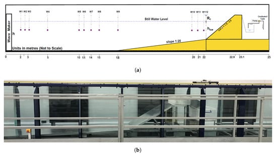 (a) Layout of a schematic cross-section of the wave gauges applied for reflection analysis. (b) Photograph of the constructed model.