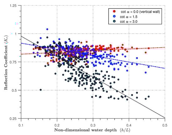 In this section, the influence of water depth, , on the reflection coefficient, , was investigated across three slopes (i.e., cot , cot , and cot ). Figure 6 presents these results for all of the datasets acquired during this study. Generally, for the steep- (cot ) and the mild-sloping (cot ) seawalls, it was found that the value of decreases with increasing relative depth . This behaviour is consistent with the findings of previous studies Neelamani and Sandya [] and Nassar and Negm [,]. These observations are peculiar to plunging-wave-breaking phenomena. For the vertical seawall, the reflection coefficient is almost independent of water depth. This is expected because of the reflection of waves by vertical walls irrespective of the depth limiting values. Standing waves are formed during these tests, and more energy is reflected than with sloping walls. These observations are similar for both the unimodal and bimodal sea states.