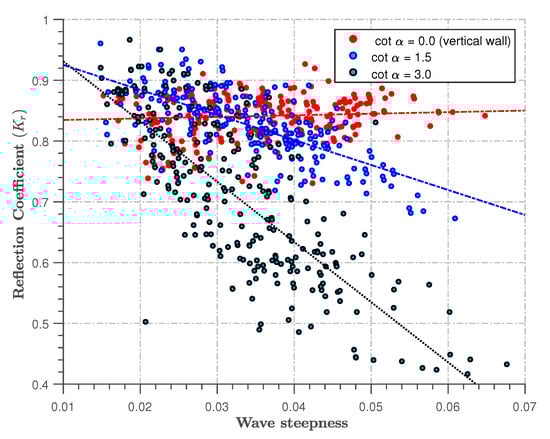 The least amount of reflection was observed for the gentle slope (cot = 3.0), which is in accordance with the observations of van Gent [] and Neelamani and Sandya [], and is a result of the wave energy dissipation.
