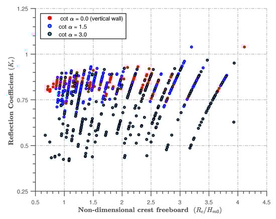 The accurate selection of the size of the crest freeboard is an essential requirement for designing coastal seawalls against wave overtopping and to serve as a flood barrier. The reliable prediction of the reflection characteristics of a coastal seawall suitable for the selected is also key. In Figure 8, is presented in terms of only across three seawall slopes. It can be seen that is directly proportional to the values of . As the crest freeboard increases, the value of also gradually increases. This implies that, as crest freeboard is reduced, there is more wave overtopping and there is a greater tendency for the reduction of reflection altogether.