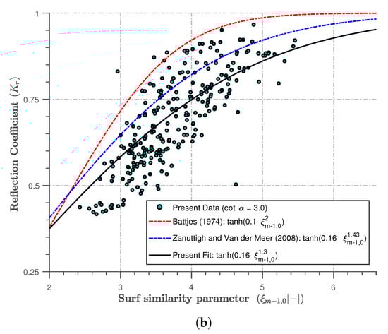 Zanuttigh and van der Meer [] proposed a revised version of Equation (4b) from over 4000 reflection coefficient experimental test results. This can be generally expressed as: