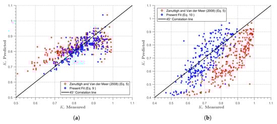 To assess the suitability and conformance of the new formulation, a correlation assessment of the new equation with that of Zanuttigh and van der Meer [] was made. Figure 10 shows a verification obtained in the present study, represented by Equations (5), (10) and (11) from Zanuttigh and van der Meer []. The observed and the predicted are fully described in this figure for the two slopes ((a) cot = 1.5; (b) cot = 3.0).