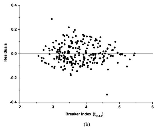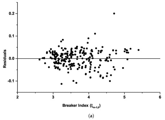As shown in these figures, observed data points are well distributed on either side within a 45° correlation line. It can be deduced from the slight convergence of the agreement between the observed and predicted values that Equations (10) and (11) work better in defining the reflection characteristics of sloping seawalls under the influence of bimodal waves than Equation (5). The prediction of a prolonged breaker index imposed by longer periods in swell waves is more accurately made with Equations (10) and (11) than with Equation (5). This under-predicts under the bimodal cases, especially with increasing gentle slopes. The present formulation, (Equations (10) and (11)) will be applicable at locations exposed to local storm waves and open oceans under bimodal wave conditions. Figure 11 expresses the appropriateness of the equation in predicting in bimodal seas, as represented in the residual plots described by the new formulations for both the steep slope (cot = 1.5) and gentle slope (cot = 3.0).