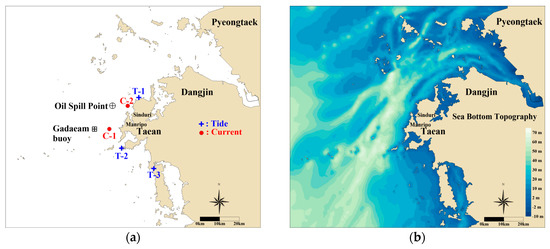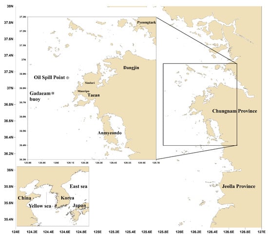 The Hebei Spirit oil spill accident in the Yellow Sea was the largest marine oil spill in South Korea (Figure 1). This oil spill occurred at about 7:30 Korea standard time (KST) on 7 December 2007 (22:30 universal time coordinated (UTC) on 6 December 2007), approximately 10 km northwest off (126°03.1′ N, 36°52.3′ E) from Manripo beach, Taean of South Chungcheong Province, Korea [1]. A crane barge (Samsung 1), which was being towed by tugs (Samsung T5 and Samho T3) collided with an anchored very large crude oil carrier (VLCC, Hebei Spirit) carrying 263,541 tons of crude oil, registered to Hong Kong, thereby damaging the VLCC cargo tanks. The collision punctured three of the five tanks and resulted in the leakage of about 10,900 tons of cargo oil (Iranian heavy crude, Kuwait export crude, and UAE Upper Zakum crude). Although the oil recovery ship with a capacity of 200–500 tons arrived shortly after the accident, it was impossible to handle the spill because of the high waves (2–4 m) and strong winds (14–16 m/s); further, the installed oil fence proved ineffective due to the high waves. According to the Korea Coast Guard (KCG) report [2], the spilled oil after the accident spread out rapidly toward coastlines because of the northwestern winds and currents during the next 30 days, thereby contaminating more than 375 km of coastlines on the west coast of South Korea. In particular, approximately 70 km of the Taean Peninsula shoreline was heavily impacted by thick stranded oil.The Ministry of Oceans and Fisheries (MOF) of South Korea predicted that the spilled oil after the incident would reach the beach within 24 h; however, it reached the beach within 13 h. The spilled oil affected the marine ecosystem because of harsh weather and the failure of initial disaster prevention. Thus, an oil spill is declared as a type of disaster because it not only causes the destruction of marine ecosystems but also incurs large costs in terms of damage compensation and cleaning up spilled oil. If the range of the spilled oil and the location and time to reach the beach are predicted accurately after the occurrence of the spill with a forecasting system that considers spilled oil diffusion, the damage can be reduced considerably.