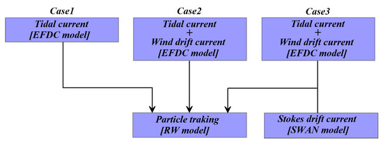 As shown in Figure 2, the numerical experiments were performed for Case 1, considering only tidal currents, and Case 2, considering tidal currents and wind drift currents simultaneously. In Case 2, additional wind time-series data were input during the numerical experiment.