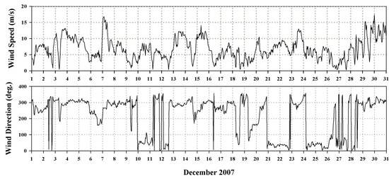 Figure 5 shows the time series data of wind direction and speed observed every hour from 1 December until 31 December 2007, on the Gadaeam buoy belonging to the Korea Meteorological Administration. The wind speed on 7 December 2007—the day of the accident—was a maximum of 16.8 m/s, and the wind direction was from the northwest. After that, the wind speed gradually decreased, and the wind direction turned eastward before and after 10 December. The wind-observation data were used as input data for the EFDC model to simulate the tidal current, considering wind drift currents.