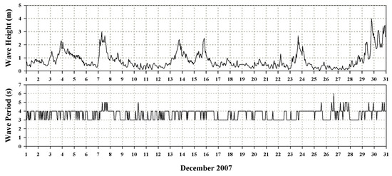 Figure 6 shows the time series data of significant wave height and period observed every hour from 1 December until 31 December 2007, on the Gadaeam buoy belonging to the Korea Meteorological Administration. The significant wave height showed a maximum of 3.0 m on 7 December 2007. After that, harsh weather continued from 3 a.m. until 3 p.m. with the wave height over 2.0 m. The significant wave period was 3.0–5.0 s t, and it showed 3.0–4.0 s except for 3.0–6.0 s 25 days after the accident. The observed wave data were used as input data for the SWAN model.