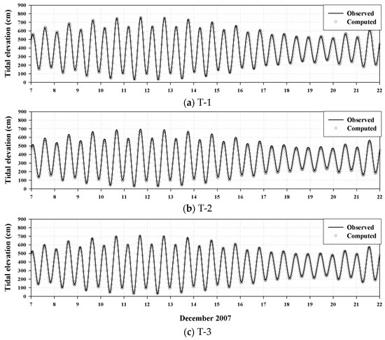 Comparison between observed and computed tidal elevation time series at (a) T-1, (b) T-2, and (c) T-3. The reference time is Korea standard time (KST).